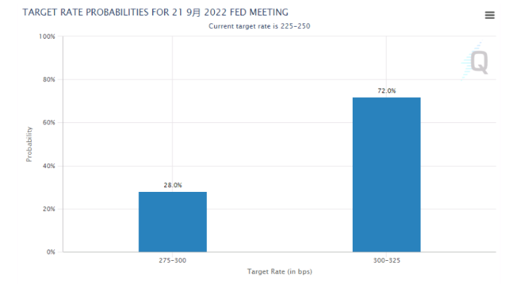 据FedWatch Tool数据,美联储到9月份加息50个基点的概率为28%,加息75个基点的概率为72%,较一个月前大幅攀升;到11月份累计加息75个基点的概率为0.9%,累计加息100个基点的概率为29.5%,累计加息125个基点的概率为69.6%。