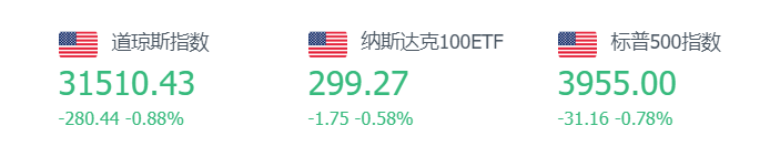 美股周三录得连续第四个交易日下跌,道指跌0.88%,报31510.43点;纳指跌0.56%,报11816.20点;标普500指数跌0.78%,报3955.00点。特斯拉收跌0.75%,Snap收高8.69%,阿里收高1.67%。