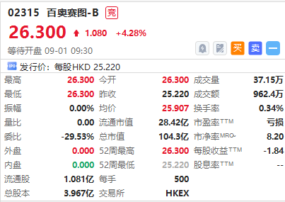 华盛资讯9月1日讯,生物技术公司百奥赛图-B $02315.HK 首挂高开4.28%,一手账面浮盈500港元,盘前成交额962万港元,最新总市值超104亿港元,昨日暗盘收涨5.08%。