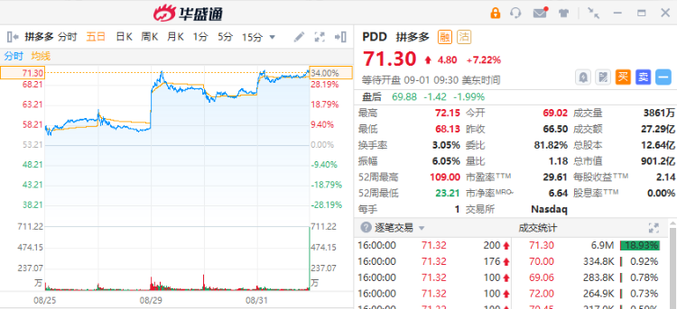- 中概股重磅利好落地叠加财报大超市场预期,拼多多近期反弹迅速。周一公布业绩当日,该股跳涨,收盘涨幅近15%,本周前三个交易日该股累涨23.85%,8月全月该股收涨45.48%,较其52周低点反弹约207%。