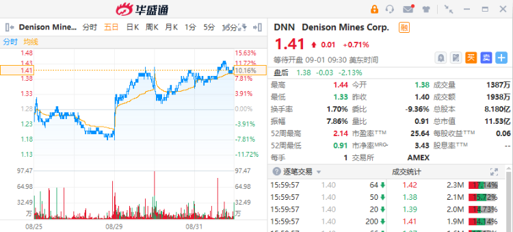 2、铀矿股持续走高,Denison Mines $DNN 周内涨近17%,机构重申该股“投资性买入”评级,华尔街看好涨再41%