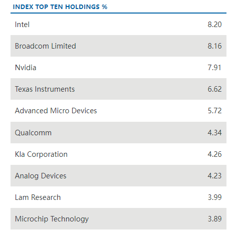 - SOXS ETF $SOXS 为3倍做空半导体指数股票的标的,由美国杠杆ETF发行商Direxion在2010年推出,追踪半导体指数the ICE Semiconductor Sector Index的表现,3倍放大该指数的波动。据Direxion官网介绍,该指数前五大重仓股为英特尔 $INTC 、博通 $AVGO 、英伟达 $NVDA 、德州仪器 $TXN 、美国超微 $AMD 、高通 $QCOM 。