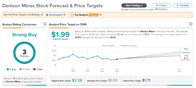 - 道明证券在上周表示,重申Denison Mines“投资性买入”评级, 目标价为2.25美元。该分析师继续预测未来几年铀的价格会上升,并且认为当前市场条件应该有利于像Denison Mines这样拥有稳定项目的开发商。