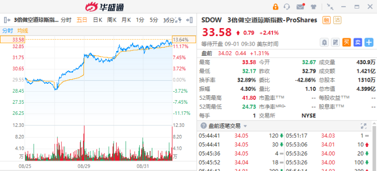 4、鲍威尔“最强鹰”击退道指近2000点,3倍做空道指ETF $SDOW 近4日上涨约17%