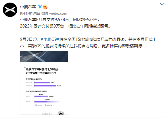 小鹏汽车:8月交付量9578辆 同比增长33%