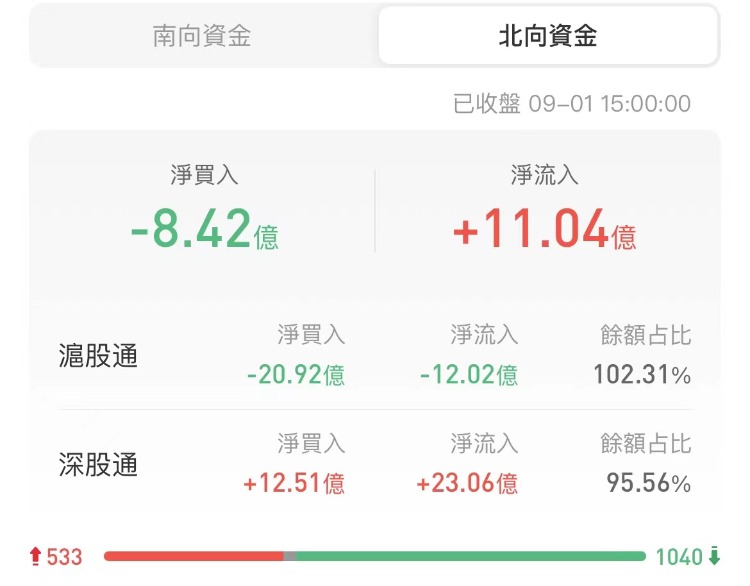 北上资金今日净卖出8.42亿元,沪股通净卖出20.92亿元,深股通净买入12.51亿元。上一交易日净买入79亿元。