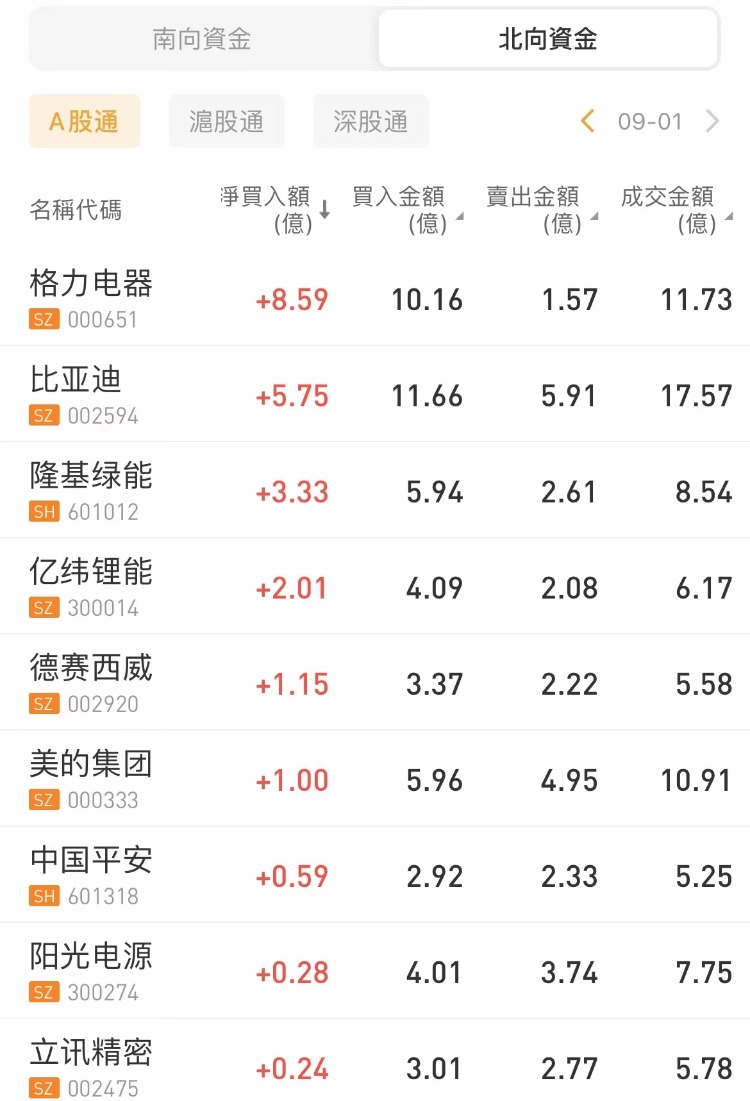 北上资金今日净买入格力电器8.59亿元,为今日买入之最;净买入比亚迪5.75亿元。
