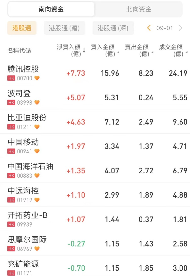 南下资金净买入腾讯控股 $00700.HK 7.73亿港元,为今日买入之最,净买入波司登 $03998.HK 5.07亿港元。此外,净买入比亚迪股份 $01211.HK 4.63亿港元,中国移动 $00941.HK 也获净买入1.97亿港元。