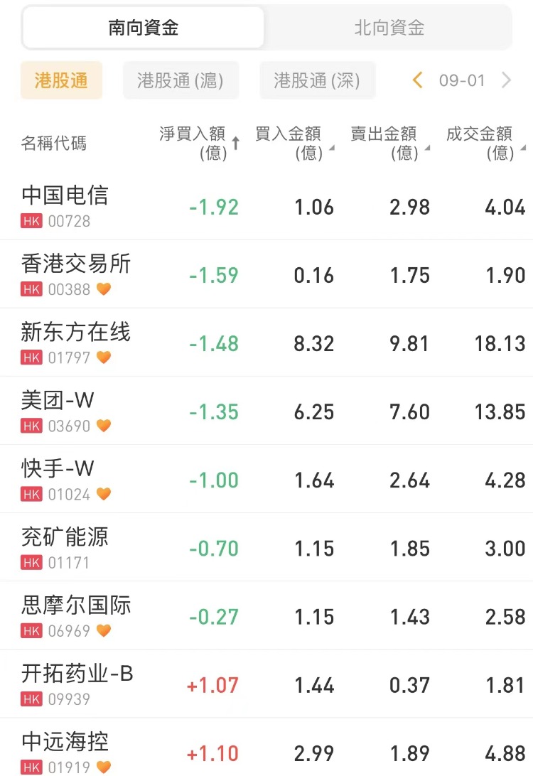 南下资金净卖出中国电信 $00728.HK 1.92亿港元,为今日卖出之最,净卖出香港交易所 $00388.HK 1.59亿港元,新东方在线 $01797.HK 遭净卖出1.48亿港元。