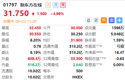 9月2日消息,新东方在线持续走高,近期已走出11连升,现涨4.96%,报31.75港元,最新市值316.22亿港元。