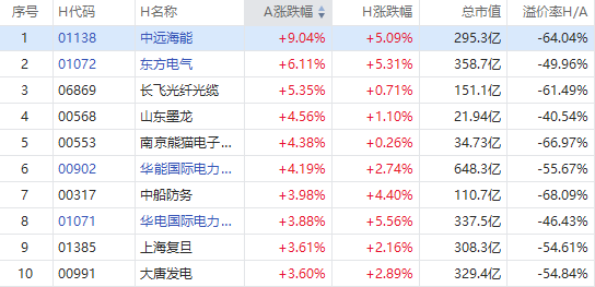 截至发稿,中远海能A股涨9.04%,H股现涨5.09%;东方电气A股涨6.11%,H股现涨5.31%;长飞光纤光缆A股涨5.35%,H股现涨0.71%。
