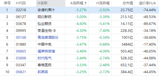 昭衍新药A股跌5%,H股现跌3.39%;青岛啤酒股份A股跌3.75%,H股跌0.34%;福莱特玻璃A股跌3.46%,H股跌4.09%。