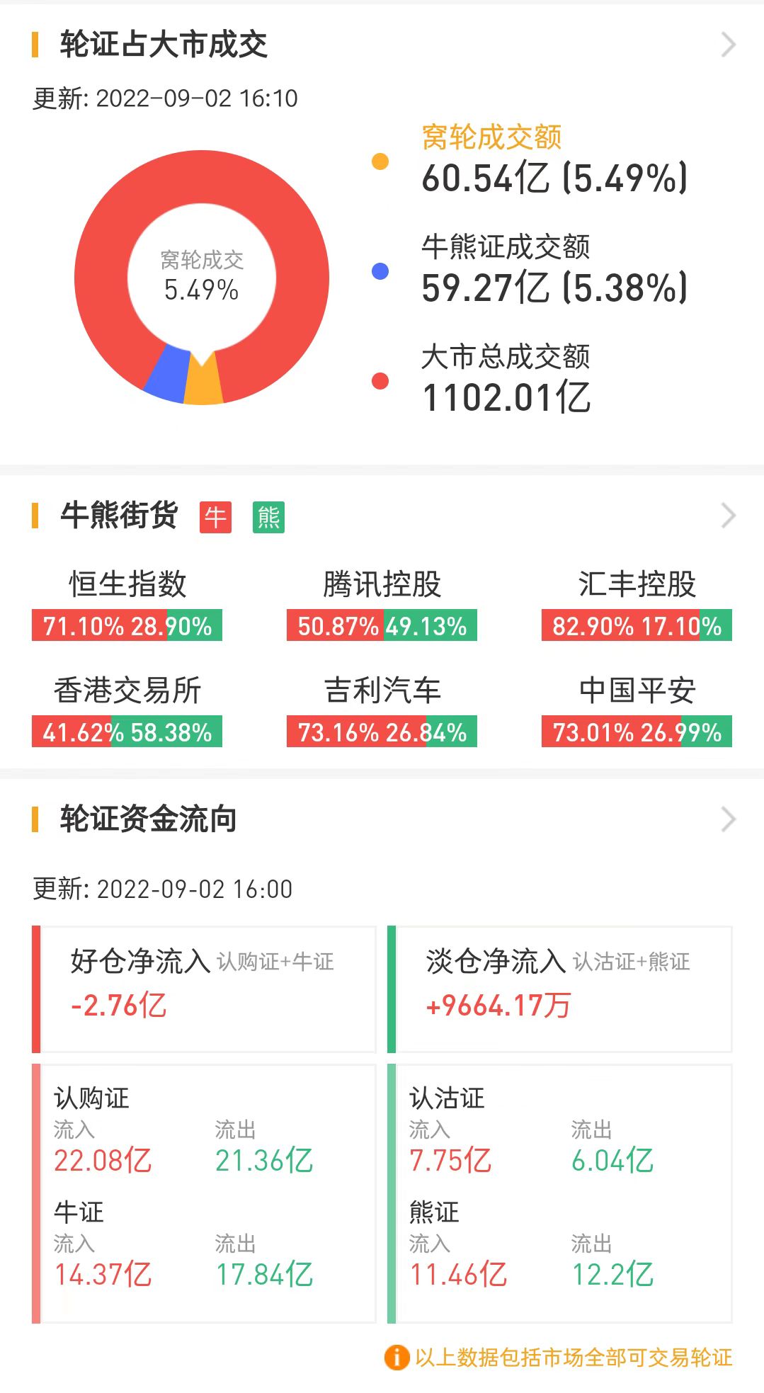 其中,窝轮总成交额为60.54亿港元,牛熊证总成交额为59.27港元。