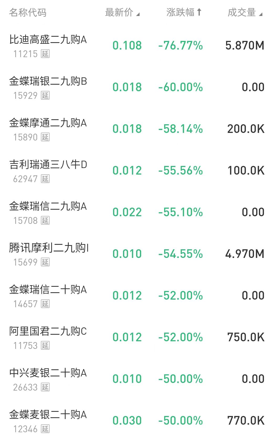 在今日跌幅榜中,比迪高盛二九购A $11215.HK 跌76.77%;腾讯魔利二九购I $15699.HK 跌54.55%。