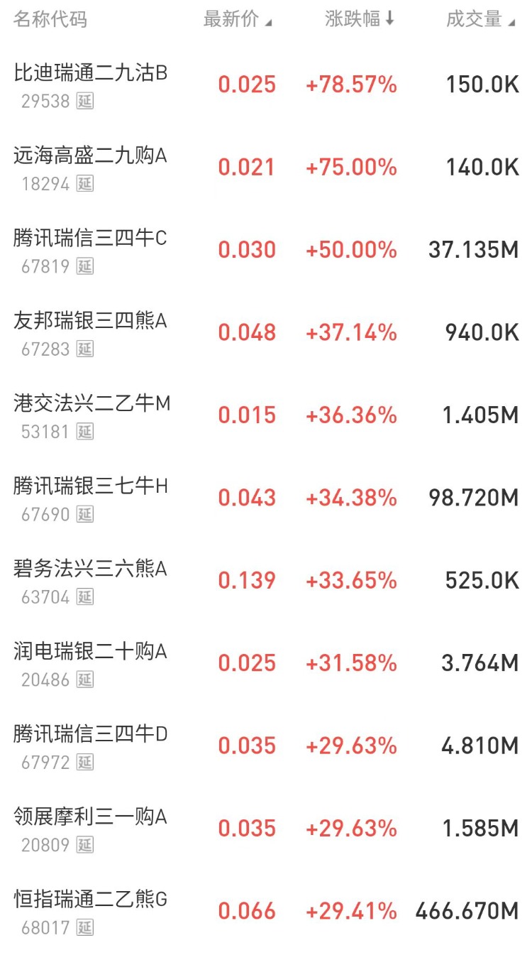 在今日涨幅榜中,比迪瑞通二九沽B $29538.HK 涨78.57%,远海高盛二九购A $18294.HK 涨75%,此外,腾讯瑞信三四牛C $67819.HK 涨50%。