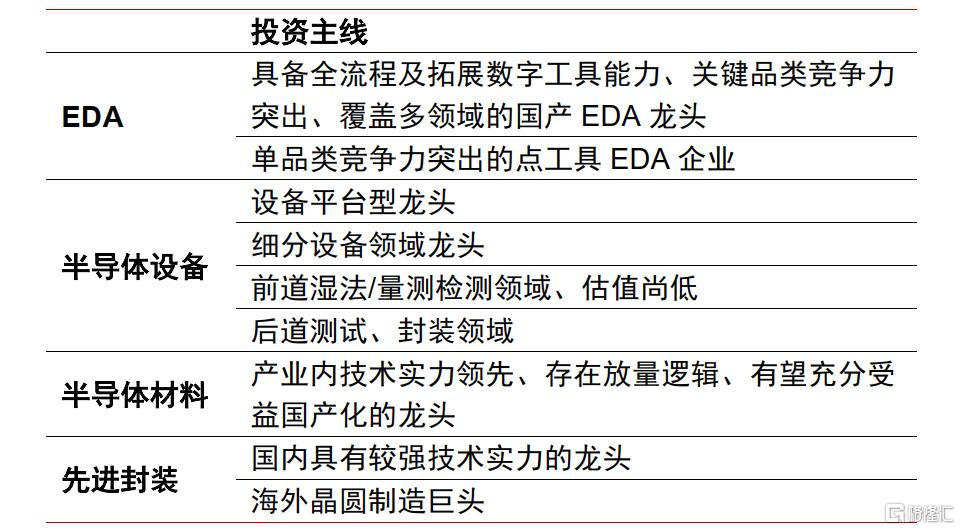 EDA方面,国内行业龙头厂商有望借鉴海外发展经验,以全定制IC设计EDA工具为起点,加速向数模混合、数字电路、晶圆制造等领域的EDA拓展,在全球EDA市场中追赶并超越。在行业景气持续、国产替代深入背景下,预计半导体设备公司将持续有基本面业绩支撑。短期在自主可控逻辑下,半导体材料龙头企业有望充分受益,提升市占率;中长期看,半导体材料需求将持续增长,看好技术实力领先,存在放量逻辑,有望充分受益国产化的龙头公司。国内先进封装行业发展较成熟,市场需求及国产替代空间巨大,技术涵盖及性能表现是行业的核心逻辑,建议关注国内具有较强技术实力的龙头。