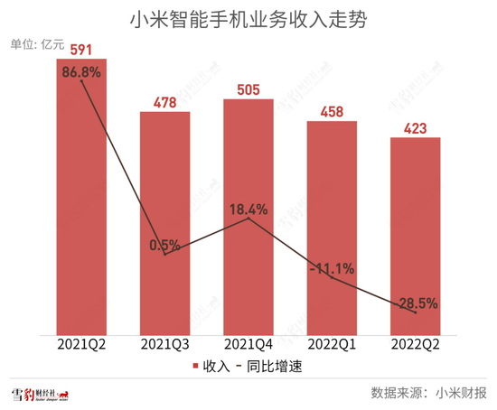2022年Q2,小米手机出货量同比下滑26.1%至3910万台,平均销售价同比下降3.2%至1081元,两年来首次量价齐跌。这意味着,小米必须找到有力的第二增长曲线。