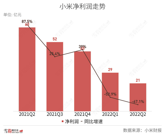 据2022年Q2财报,小米当季营收同比下滑20.1%至701.71亿元,经调整净利润20.81亿元,同比下降67.1%,创近3年来的新低。