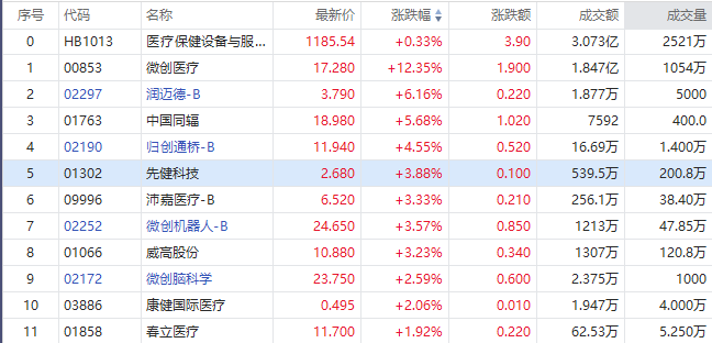 华盛资讯9月5日讯,港股医疗设备股普遍高开高走,截至发稿,微创医疗(00853)大涨12.35%,润迈德-B涨超6%,归创通桥-B涨超4%,微创机器人、沛嘉医疗-B涨超3%。