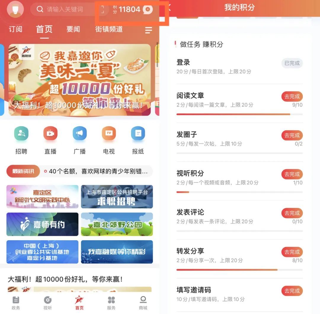 “上海嘉定”app首页右上角“积分”查看,