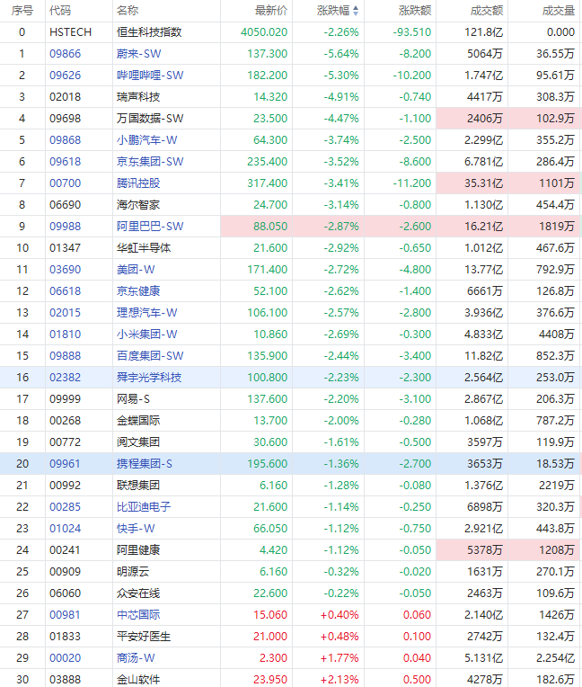 造车新势力再度大跌,蔚来-SW跌近6%,小鹏汽车-W跌超4%;科网股集体走弱,哔哩哔哩-SW大跌5.30%,京东集团-SW、腾讯控股跌超3%,阿里巴巴跌超2%。
