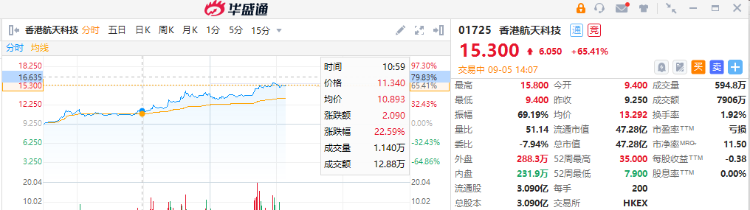 华盛资讯9月5日消息,香港航天科技(01725.HK)持续走高,最高涨近70%,现涨幅回落至65%,报15.3港元。该股获调入深港通下的港股通标的证券名单。