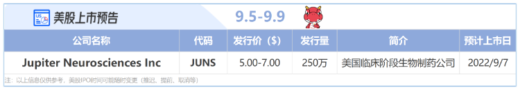 募资情况:Jupiter Neurosciences Inc.计划于本周二(9月7日)在纳斯达克上市,此次计划发行250万股股票,发行价格为5-7美元,预计融资金额1500万美元。