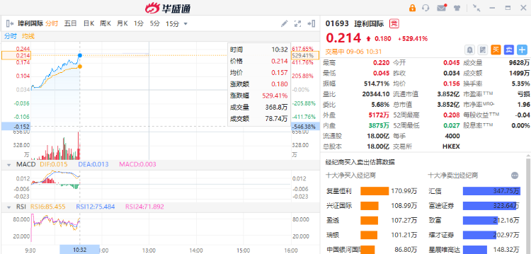 璋利国际复牌暴涨超500%,公司此前停牌已达20个月。璋利国际(01693.HK)发布公告,由于复牌指引已获履行,公司已向联交所申请于2022年9月6日上午9:00起于联交所恢复股份买卖。