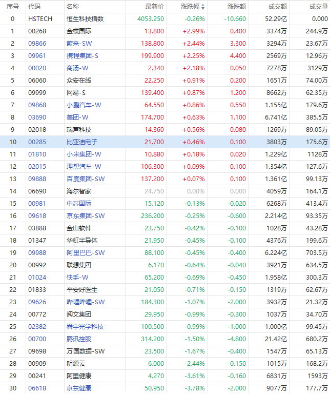 科网股涨跌不一,截至发稿,蔚来-SW、携程集团-S、商汤-W涨超2%;腾讯控股跌1.57%,哔哩哔哩-SW跌1%。
