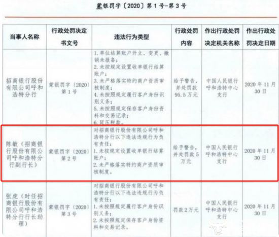 值得一提的是,陈敏还曾被罚过。2020年11月30日,招行呼和浩特分行因单位结算账户开立、变更、撤销未报备;未按规定设置收单银行结算账户;未严格落实特约商户资质审核制度;未按照规定履行客户身份识别义务;未按照规定保存客户身份资料和交易记录;延压税款六宗违法违规行为被中国人民银行呼和浩特中心支行警告并罚款95.5万元。