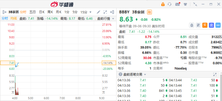 3B家居(BBBY)盘前跌14.14%,此前报道称公司CFO坠楼身亡,被指控和大股东合谋“割韭菜”。