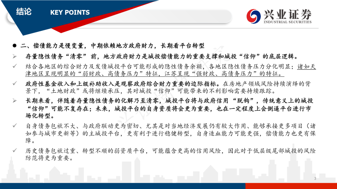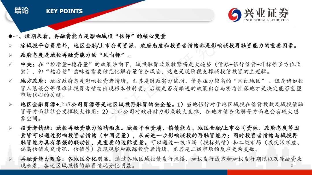 拥有“信仰”加持的城投债,一直是市场关注的焦点。城投债“信仰”还能持续多久,城投债投资需要关注什么?本文尝试从短期和中长期的视角对城投债“信仰”进行再解析,构建了城投偿债与再融资能力的动态平衡观察体系,从多个维度解析了偿债能力和再融资能力背后的逻辑支撑与重要的跟踪变量,并将政府、平台和投资人三方的联动关系穿插其中,供投资者参考。