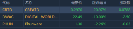 特朗普概念股重挫,截至发稿,CRTD $CRTD 跌近21%,报0.297美元。DWAC $DWAC 跌10%,报22.49美元,知情人士透露,DWAC提议推迟一年完成与特朗普旗下社交媒体公司Truth Social的借壳上市交易,但这项提案尚未获得足够的股东支持。PHUN $PHUN 跌超2%。