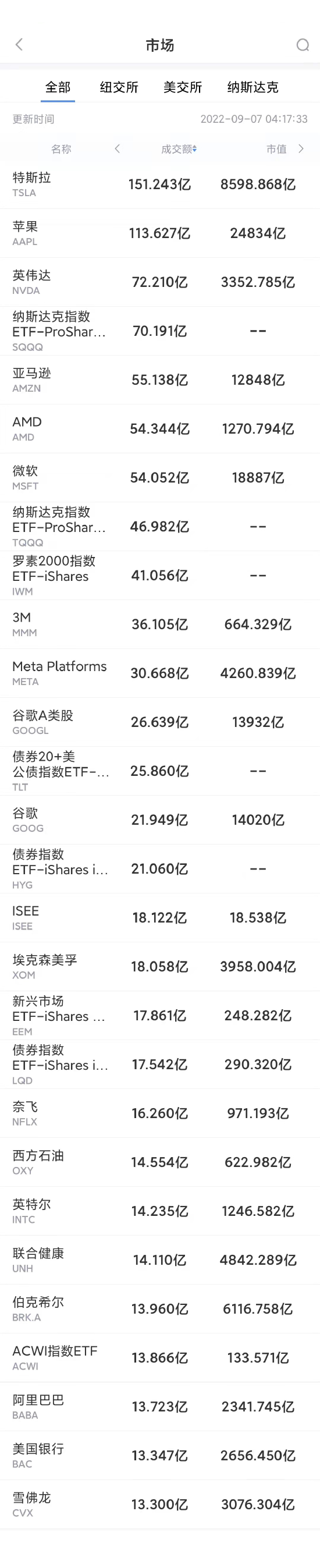 第3名英伟达收跌1.33%,成交72.2亿美元。有报道称,著名投资者凯西-伍德(Cathy Wood)上周卖掉了在特斯拉持有的部分股份,购买了英伟达的股票。报道称,她似乎利用英伟达的暴跌买入了这家半导体巨头的股票。