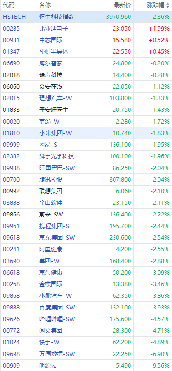科网股集体走弱,截至发稿,快手-W、哔哩哔哩-SW跌超4%,百度集团-SW跌3.93%,美团-W、腾讯控股、京东集团-SW跌超2%。
