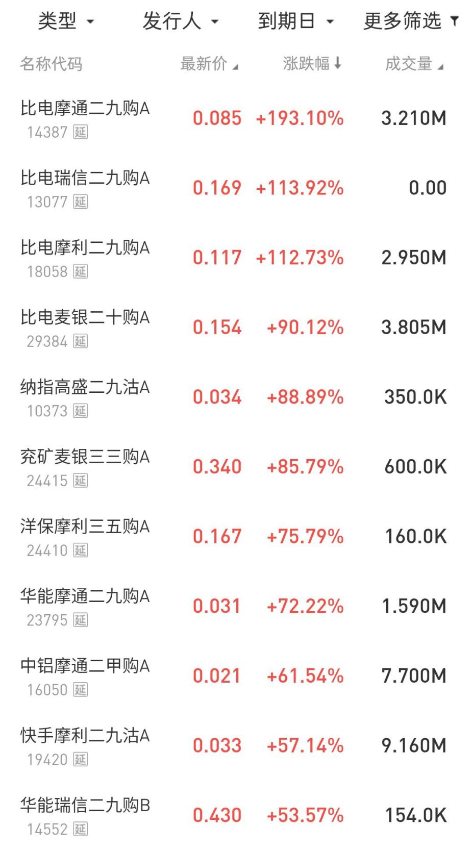 在今日涨幅榜中,比电摩通二九购A $14387.HK 涨193.1%,纳指高盛二九沽A $10373.HK 涨88.89%,此外,华能摩通二九购A $23795.HK 涨72.22%。