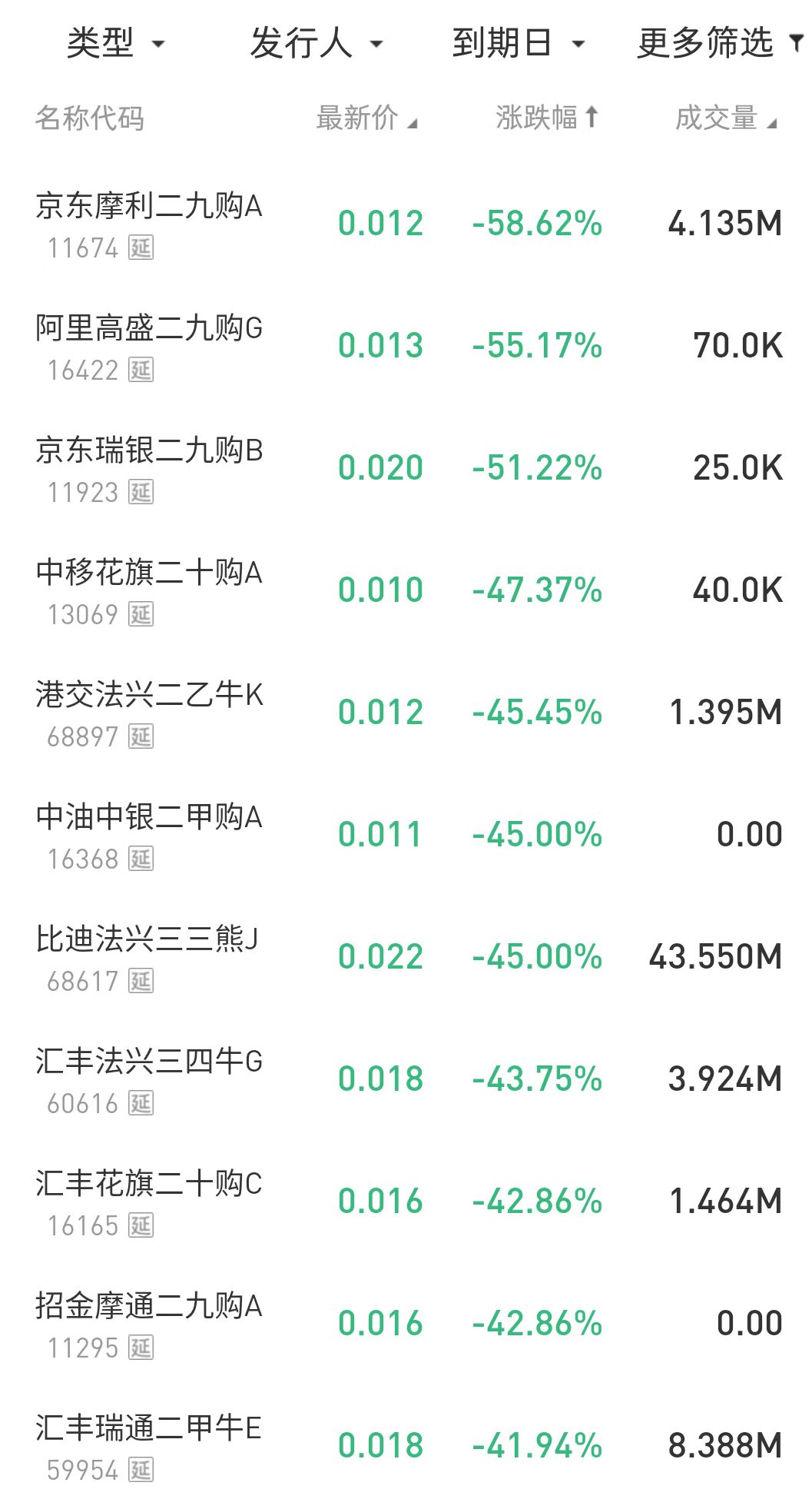 在今日跌幅榜中,京东摩利二九购A $11674.HK 跌58.62%;阿里高盛二九购G $16422.HK 跌55.17%。