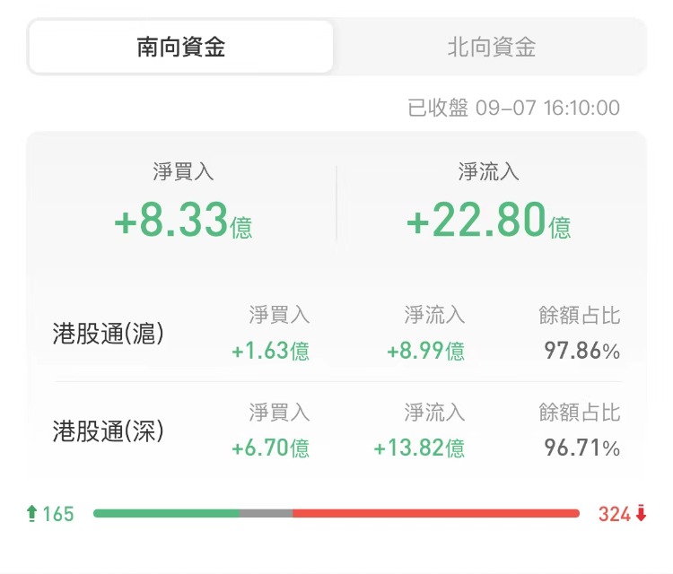 南下资金今日净买入港股8.33亿港元,其中港股通(沪)净买入1.63亿港元,港股通(深)净买入6.7亿港元。上一交易日净买入港股9.48亿港元。