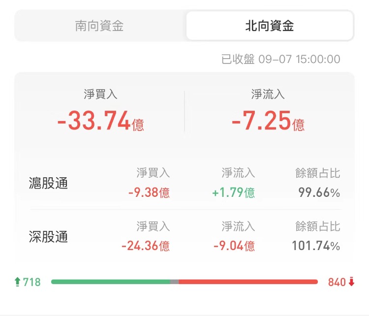 北上资金今日净卖出33.74亿元,沪股通净卖出9.38亿元,深股通净卖出24.36亿元。上一交易日净卖出38.99亿元。