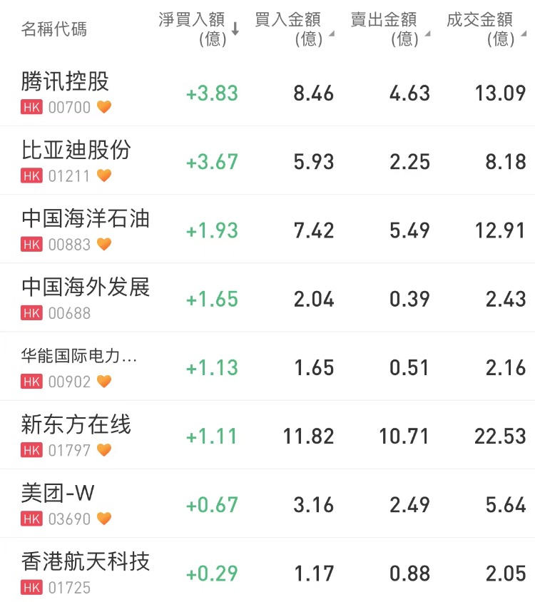 南下资金净买入腾讯控股 $00700.HK 3.83亿港元,为今日买入之最,净买入比亚迪股份 $01211.HK 3.67亿港元。此外,中国海洋石油 $00883.HK 获净买入1.93亿港元,中国海外发展 $00688.HK 也获净买入1.65亿港元。