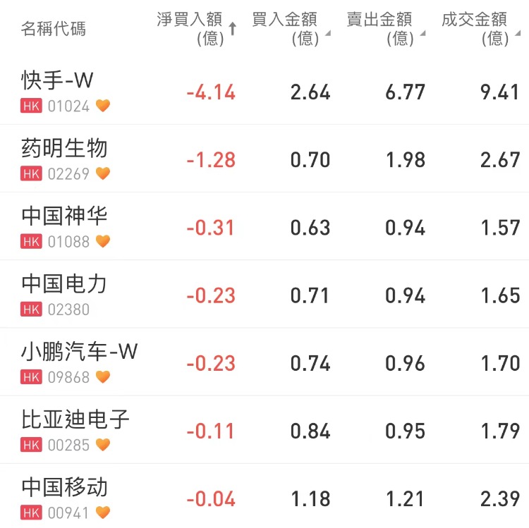 南下资金净卖出快手 $01024.HK 4.14亿港元,为今日卖出之最,净卖出药明生物 $02269.HK 1.28亿港元,中国神华 $01088.HK 遭净卖出0.31亿港元。
