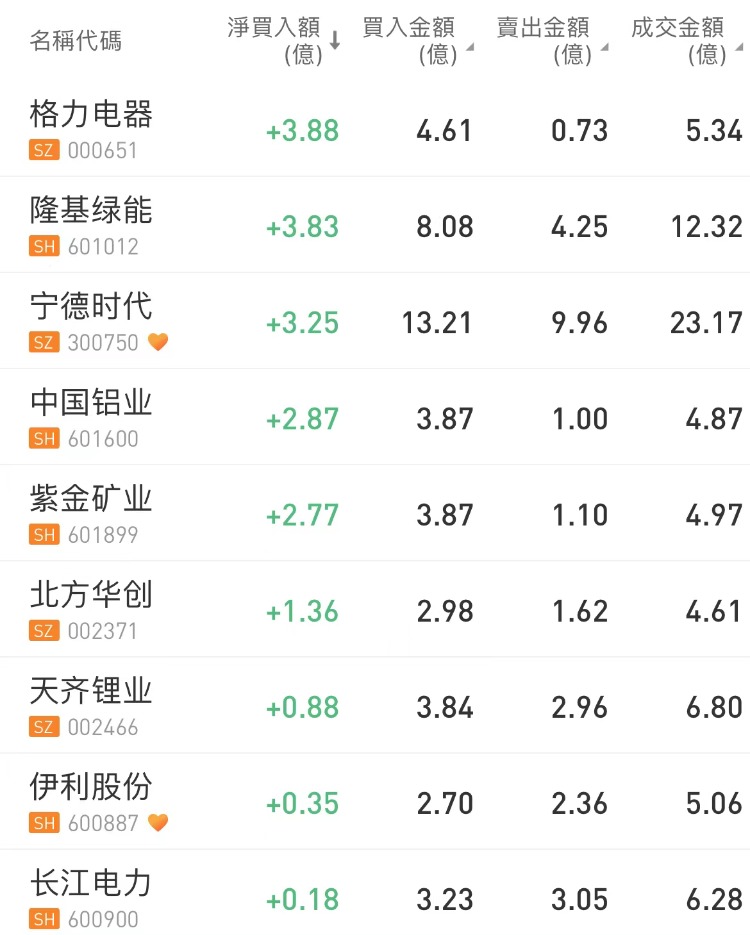 北上资金今日净买入格力电器3.88亿元,为今日买入之最;净买入隆基绿能3.83亿元。