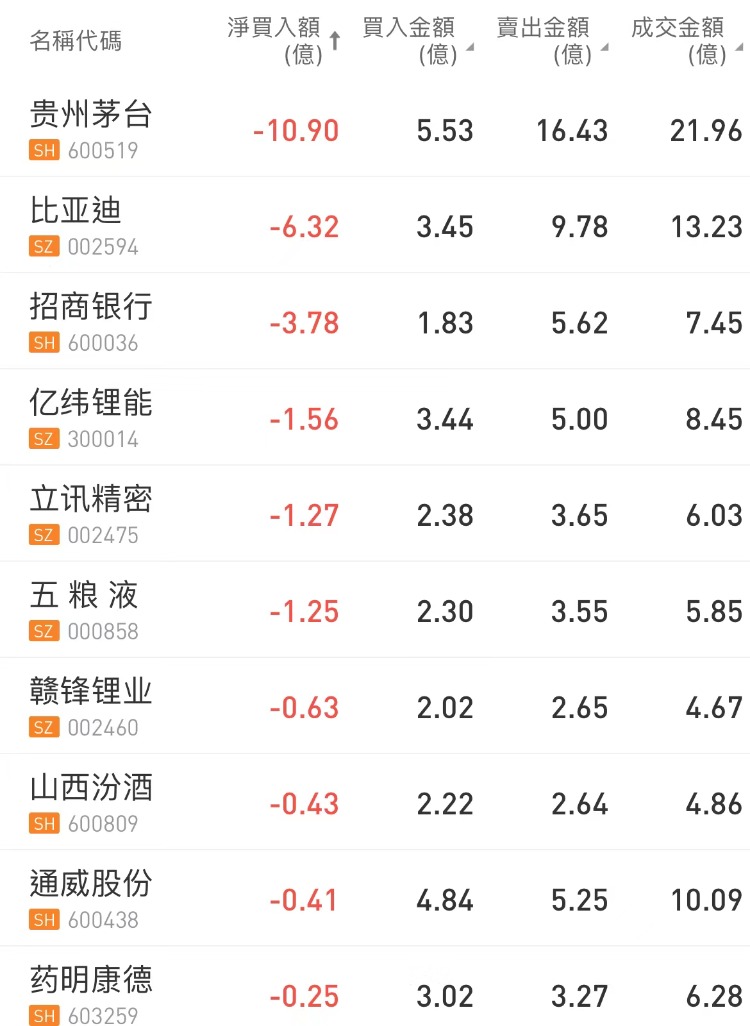 今日北上资金净卖出贵州茅台10.9亿元,比亚迪遭净卖出6.32亿元。