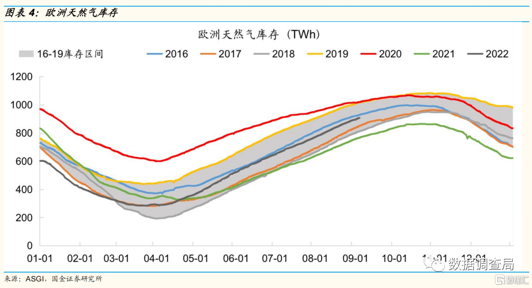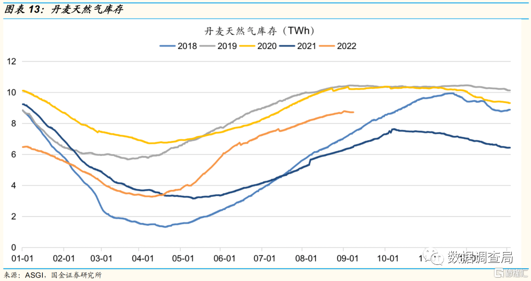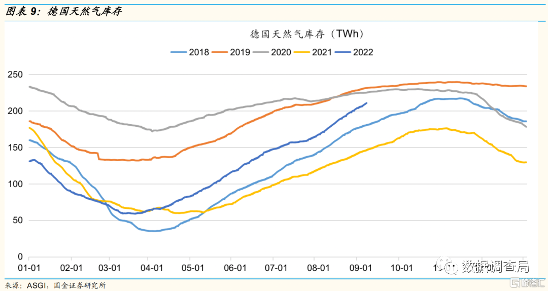 通过对欧洲今年8月天气数据与历史数据对比,可以显著发现欧洲夏季高温相比历史水平出现了较大差异,与此同时,参考WMO(世界气象组织)最新报告,2022年9月至11月有70%概率为拉尼娜气候,2022年12月至2023年2月约有55%概率为拉尼娜气候,而天然气的冬季取暖消费量与温度有较大关联度,欧洲今冬为冷冬概率越大,欧洲去库速度越趋向于悲观情景假设。