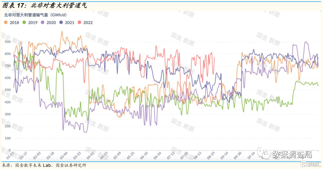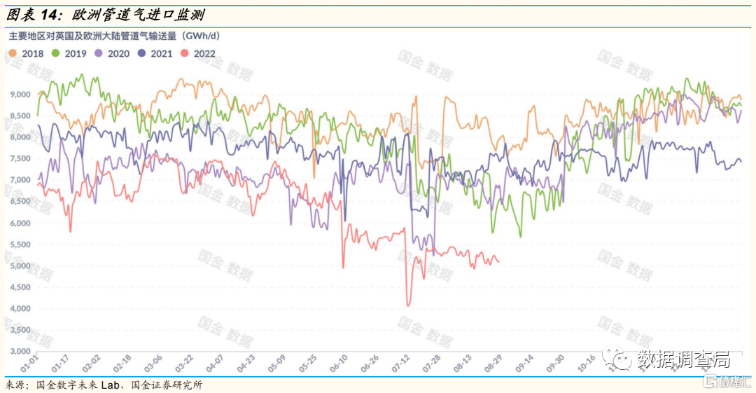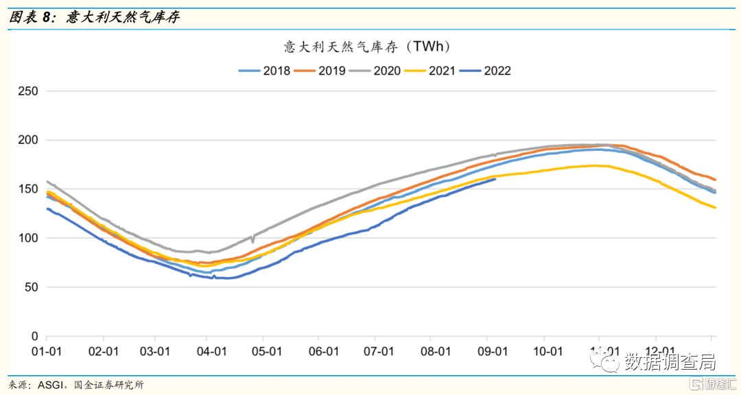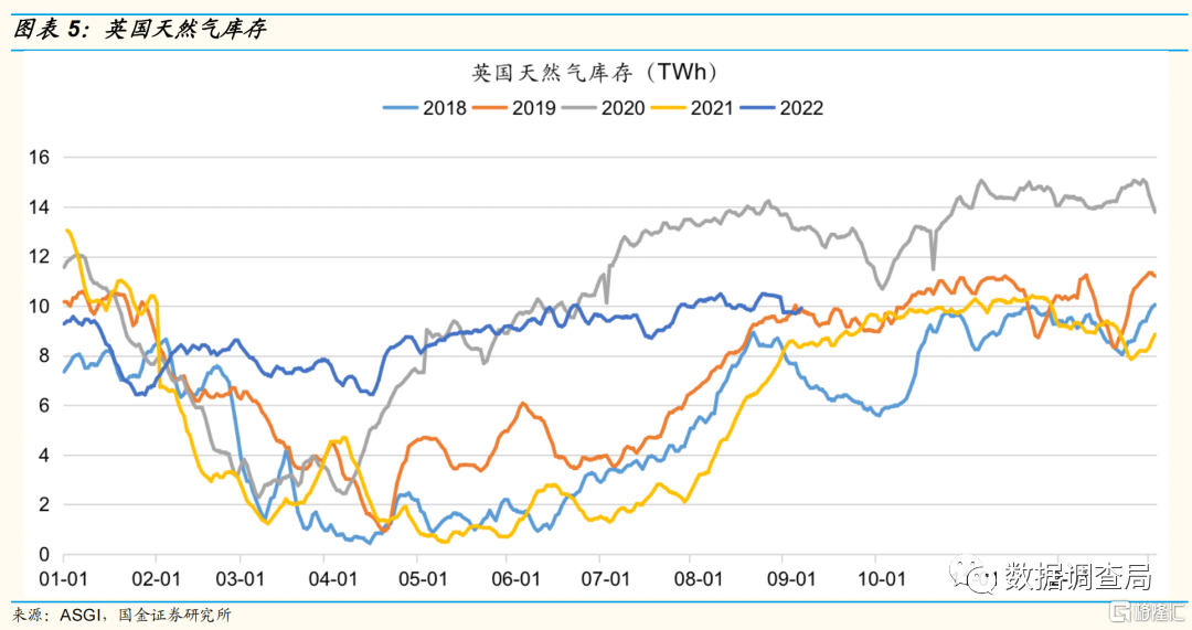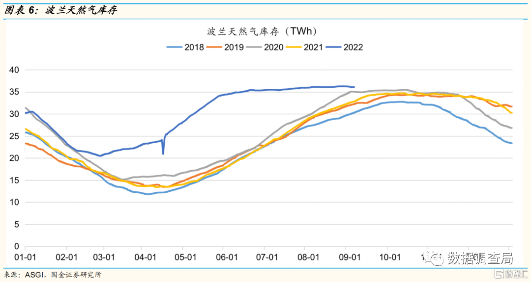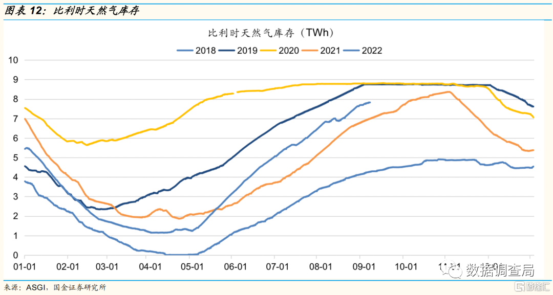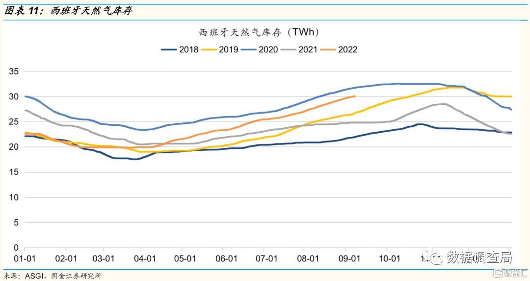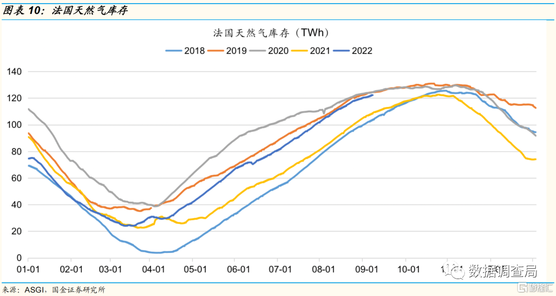 通过对欧洲主要国家的天然气进出口、气化厂、库存数据追踪,虽然今年欧洲管道气进口受俄乌冲突等地缘政治影响出现显著下滑,但通过大幅增大LNG进口量,当前英国、葡萄牙、波兰已基本达到满库状态,部分重点国家如意大利、法国、德国储气量也超80%,基本完成前期储气规划。