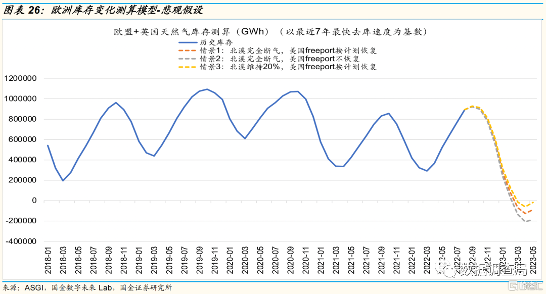 参考过去7年欧洲最快去库速度为悲观假设参考基数,以北溪一号是否恢复20%供应量,美国自由港是否恢复运营对今冬欧洲在悲观情景下的去库情况进行测算。在悲观假设下,欧洲天然气库存预计2023年2月就基本消耗完毕,后续欧洲将面临天然气短缺困境。