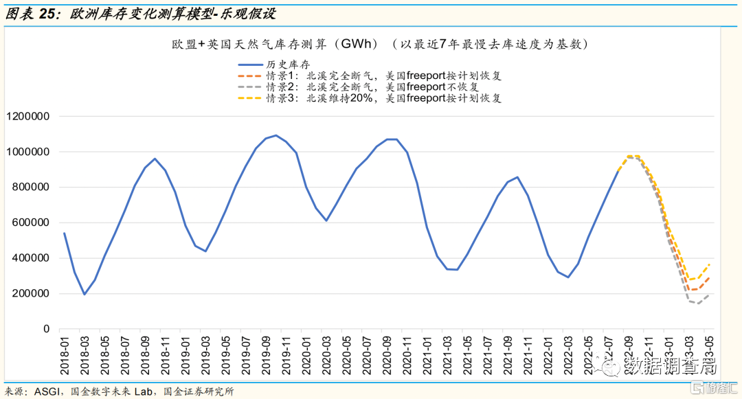 参考过去7年欧洲最慢去库速度为乐观假设参考基数,以北溪一号是否恢复20%供应量,美国自由港是否恢复运营对今冬欧洲在悲观情景下的去库情况进行测算。在乐观预期下,欧洲天然气库存在2023年4月预计在143TWH-290TWH,这一预期已与历史最低值持平。