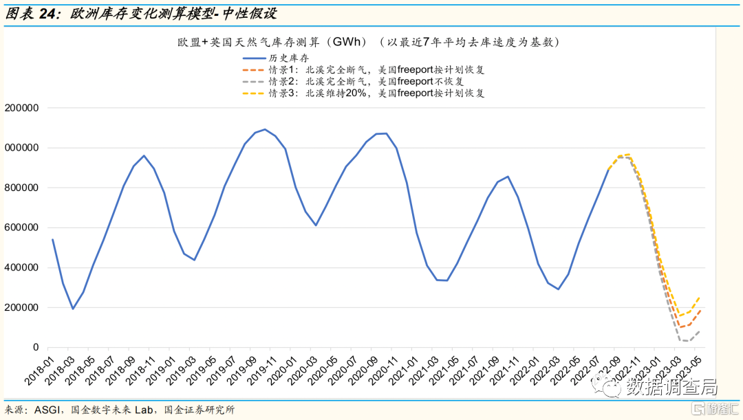 我们回溯了过去7年欧洲天然气库存在消费旺季的去库速度,并以此假设不同情景对今冬欧洲天然气去库情况测算进行模型构建,以过去7年平均水平为中性假设,最快去库速度为悲观情景,最慢去库速度为乐观情景并考虑了北溪一号恢复20%输气量与否及美国自由港恢复供应与否作为今年天然气去库速度的边际影响量,对欧洲今年9月至明年5月天然气库存数据进行模型测算。