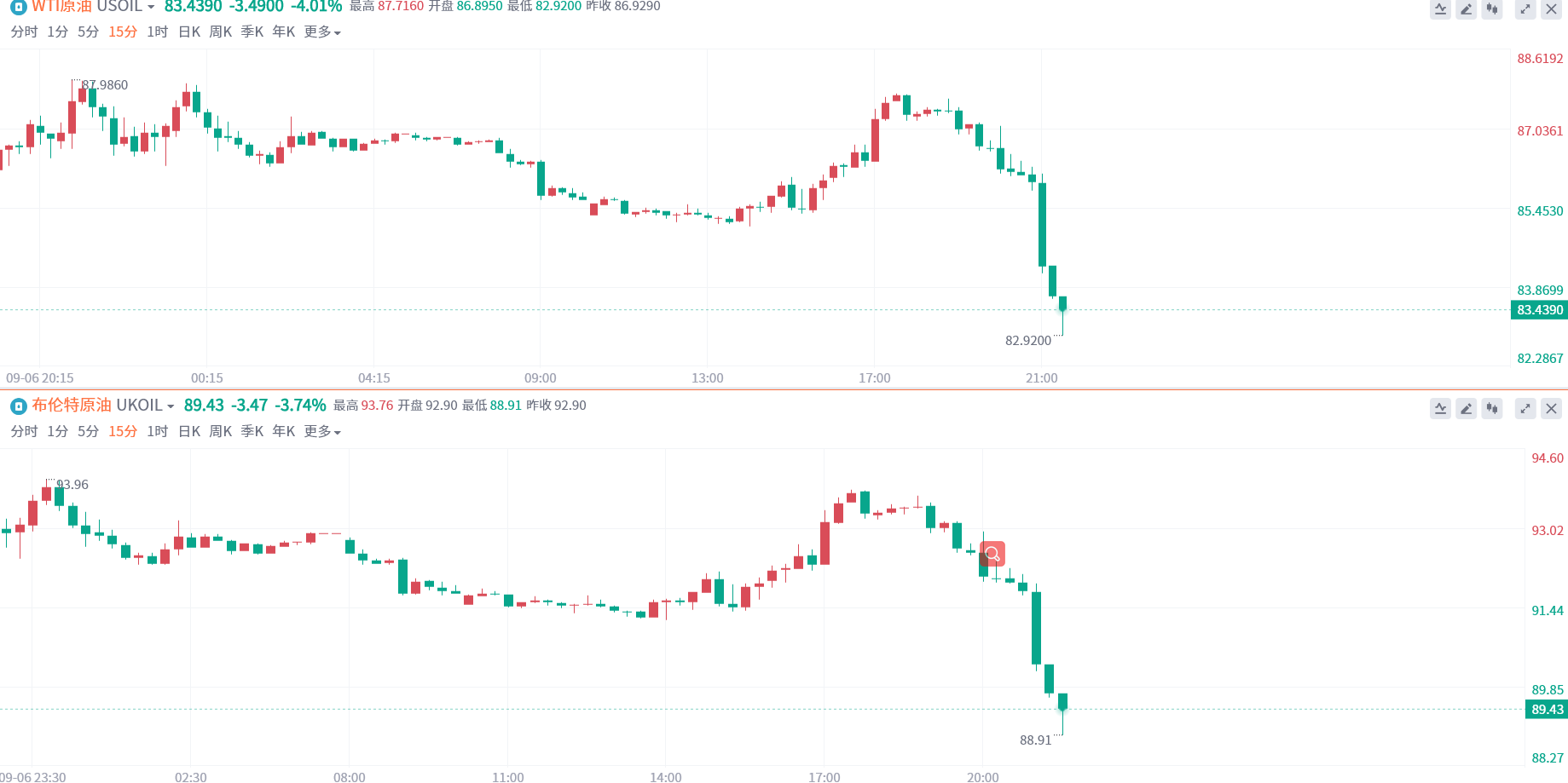 周三美盘时段,两油一度跌超4%,布伦特原油自今年2月以来首次失守90美元/桶,并回吐此前由欧佩克及其盟国周一决定减产所驱动的涨幅。