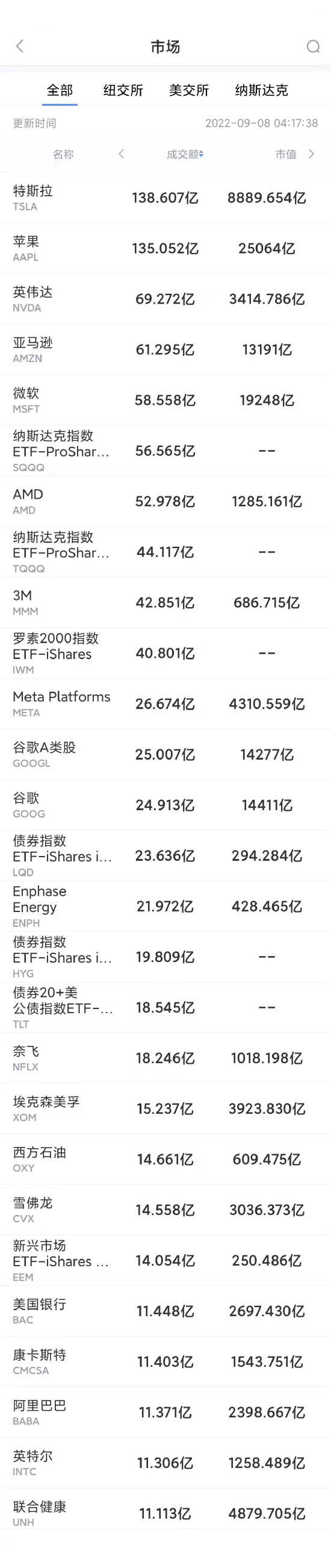 以下为美股当日交易最活跃的20只股票(按成交额):